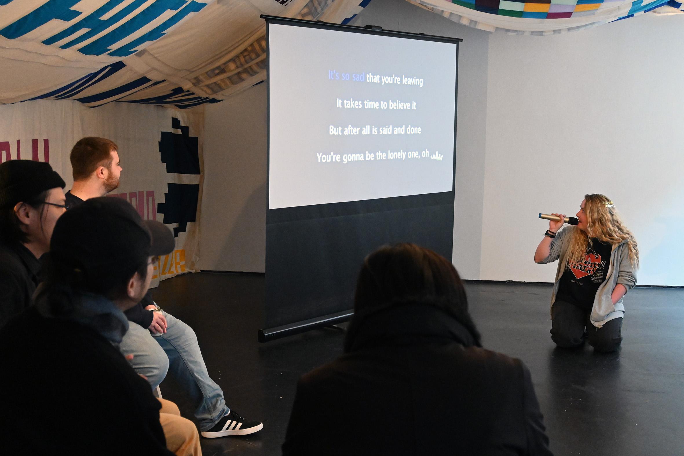 People performing at Grief Karaoke at Bloc Projects, 2024; Flyer and sign up sheet for Grief Karaoke at Bloc Projects, 2024
